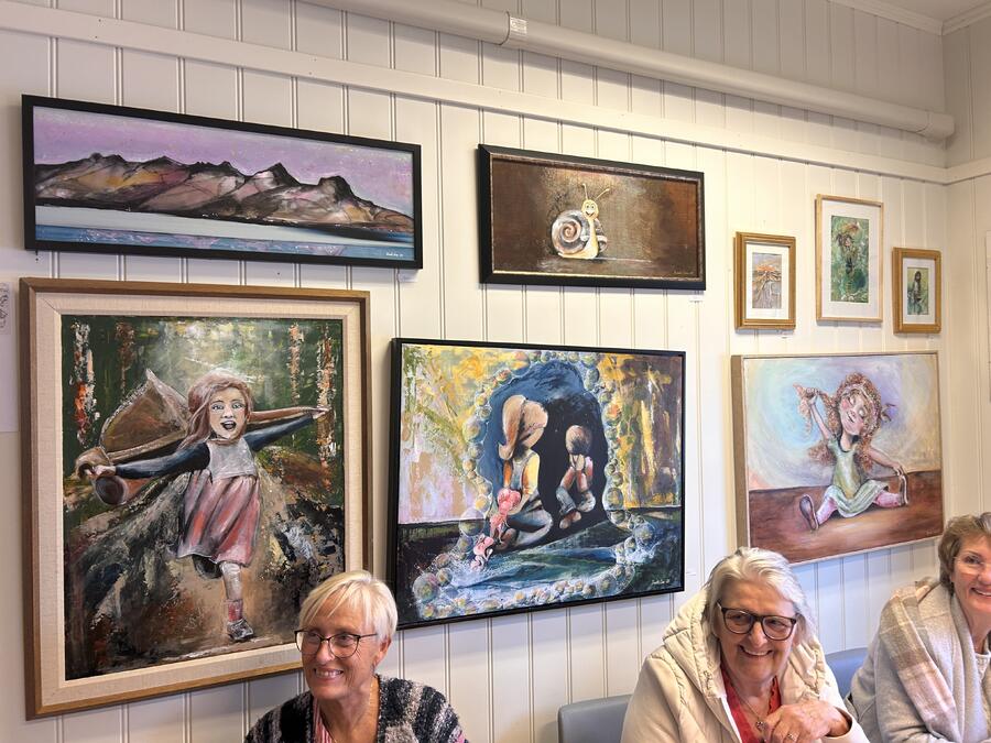 Bente Lien stilte blant annet ut flere av sine malerier, og Ann Karin Milne fra Mo i Rana viste fram sine flotte quiltearbeider. Quilting er en tekstilkunst og håndverksteknikk der man syr sammen flere lag med stoff for å lage et tykkere, polstret materiale – ofte brukt til tepper, veggdekorasjoner, klær og tilbehør.